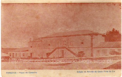 Postal dos antigos Paços do Concelho de Paredes e do extinto Concelho de Aguiar de Sousa. A data será de finais do século XIX ou inícios do século XX. Note-se que o pelourinho ainda não tinha sido reconstruído frente ao edifício principal.